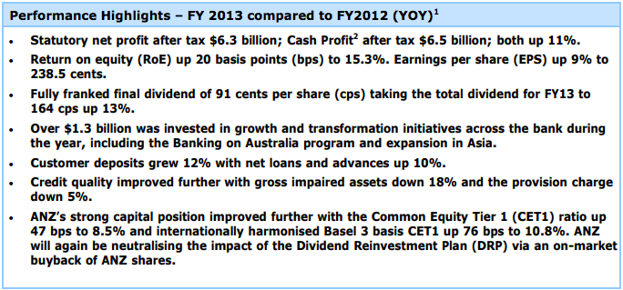 “In 2013 we have continued to attract more customers with further market share gains in Australian Retail and Commercial. In New Zealand brand consideration is at an historic high and we are growing market share in home loans and Small Business Banking. In Wealth we are providing more financial solutions to more ANZ customers while using innovation to create new growth opportunities.