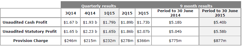 - For the nine month period to 30 June 2015, Cash Profit was $5.4 billion, an increase of 4.3% on the same period in 2014 ($5.18 billion). Profit before Provisions over the same period grew 5.1% (+3.4% on a constant Foreign Exchange (FX) basis).