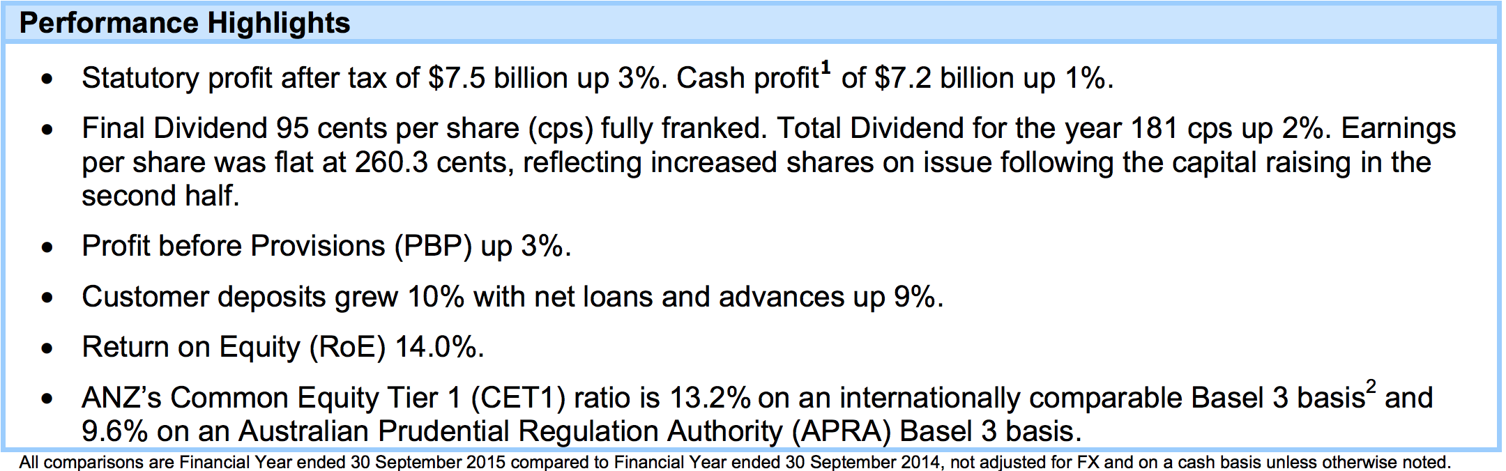 ANZ Chief Executive Officer Mike Smith said: “We have produced another record result in FY15. In a constrained environment, we have continued to see growth in our core customer franchises in Australia, in New Zealand and in key Asian markets, partly offset by the effect of macro-economic headwinds on the International and Institutional Banking Division.