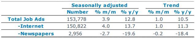 - The number of internet job ads grew 4.0% m/m in September following an increase of 1.3% m/m in August. Internet job ads were 13.7% higher than a year earlier.