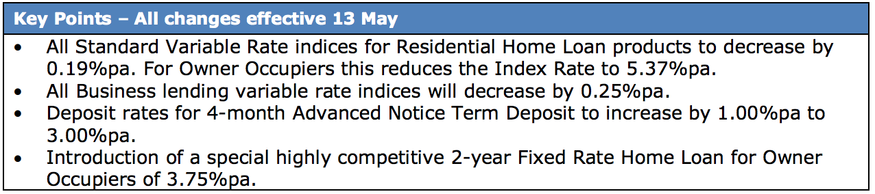 “Our rates remain low by historical standards and our standard variable residential rates remain competitive having maintained the lowest standard variable rate for almost three years. For customers wanting to lock-in low rates, we’ve introduced a highly competitive 2- year Fixed Rate home loan of 3.75%pa.