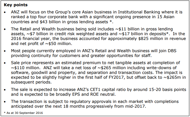 Subject to regulatory approval, ANZ expects the sale of its Retail and Wealth businesses in Singapore, Hong Kong, China, Taiwan and Indonesia to be completed during 2017 and early 2018.