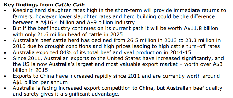 The report suggests a 10 year timeframe to lift Australia’s herd size, which sits at a 20 year low of 23.3 million. The report also concludes that the herd number could potentially fall further before it rises, pressured by recent drought conditions in key production regions and continued high demand.