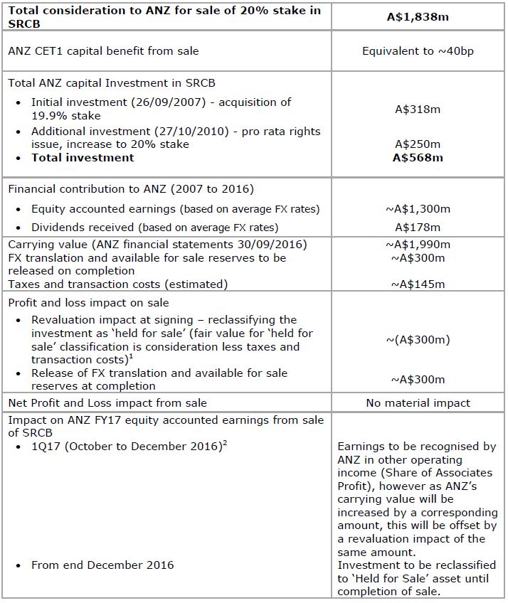 2. For comparative purposes, in financial year 2016 ANZ recorded post-tax profit of A$259m (full year profit) associated with its 20% stake in SRBC.