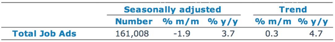 Job advertisements fell 1.9% m/m in December following a 1.6% rise in the previous month. Annual growth in job ads dropped to 3.7% y/y, down from 6.0% y/y in November.