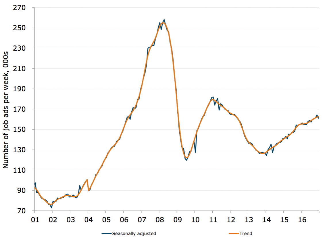 In trend terms, job ads rose 0.3% m/m in November, a touch lower than the 0.4% rise in the previous month. Annual growth remained stable at 4.7% y/y in the month of December, but has fallen sharply from an average of 9.4% y/y over Q1 2016.