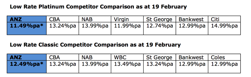 Effective Thursday 23 February, ANZ will reduce the purchase rate on its Low Rate Platinum card by 2.00%pa to 11.49%pa, and its Low Rate Classic card by 1.00%pa to 12.49%pa.