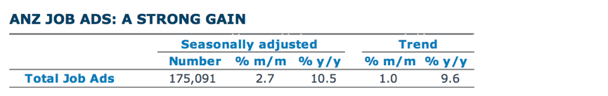 ANZ Job Advertisements rose a solid 2.7% m/m in June in seasonally adjusted terms, following a modest 0.4% rise the previous month. Job ads have risen 4.9% since the start of 2017. Annual growth jumped from 7.4% last month to 10.5% in June.
