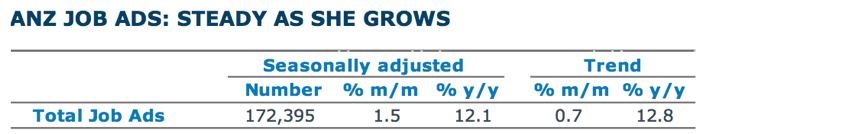 In seasonally adjusted terms, ANZ Job Advertisements rose 1.5% in November following a 1.5% increase in the prior month. On an annual basis Job Advertisements are up 12.1% a tick down from the 12.5% y/y pace last month.