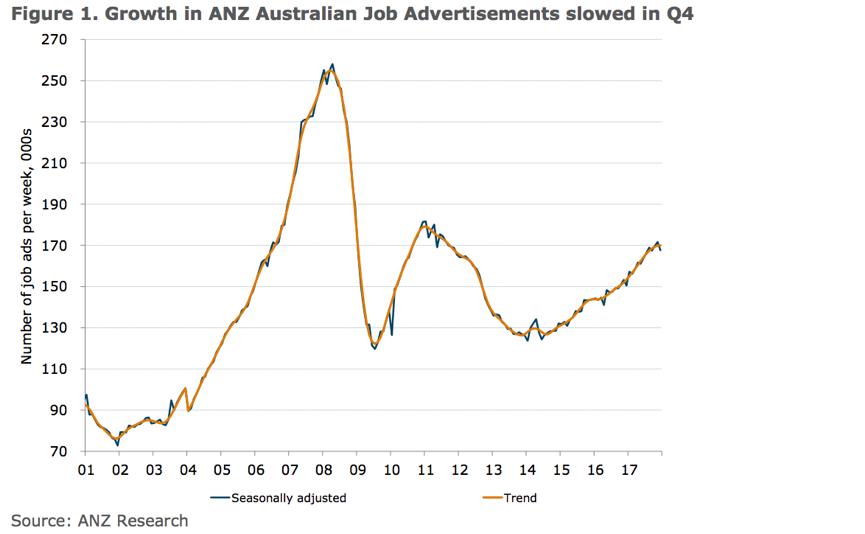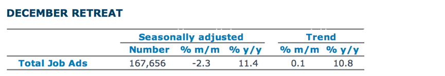In trend terms, job ads were up 0.1% m/m in December. The m/m trend which averaged 1.2% and 0.9% over Q2 and Q3 2017 respectively has slowed to 0.3% m/m in Q4.
