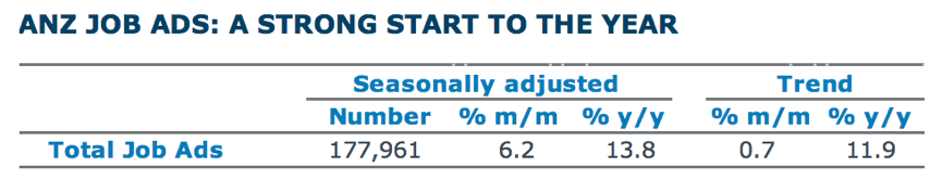 - In seasonally adjusted terms, ANZ Job Advertisements jumped 6.2% m/m in January, more than reversing the 2.7% fall in the previous month. On an annual basis, job ads are up 13.8%, a step up from the 11.4% y/y rise in December.