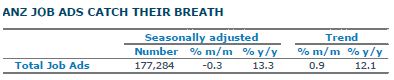 ANZ Australian Job Advertisements fell 0.3% m/m in February, on the back of a sharp 6.2% rise in the previous month. The number of job ads currently sits 13.3% higher than a year ago.