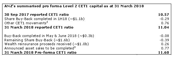 ANZ’s reported Level 2 Common Equity Tier 1 capital (CET1) ratio as at 31 March 2018 was 11.04%. This would increase by ~56bp on a pro forma basis after adjusting for completion of the buy-back, receipt of the reinsurance proceeds and completion of announced asset sales.
