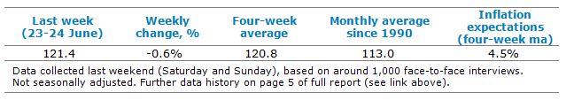 “Consumer confidence has consolidated over the past two weeks, after jumping sharply in early June, leaving the four week moving average at four month highs.
