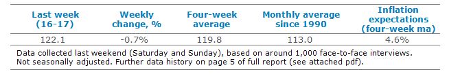 ANZ-Roy Morgan Australian Consumer Confidence weakened slightly (-0.7%) over the week to 122.1, a solid performance following the large 5.6% jump the previous week and leaving the index comfortably above its long term average. The details were mixed, with two out of the five subindices posting positive readings.