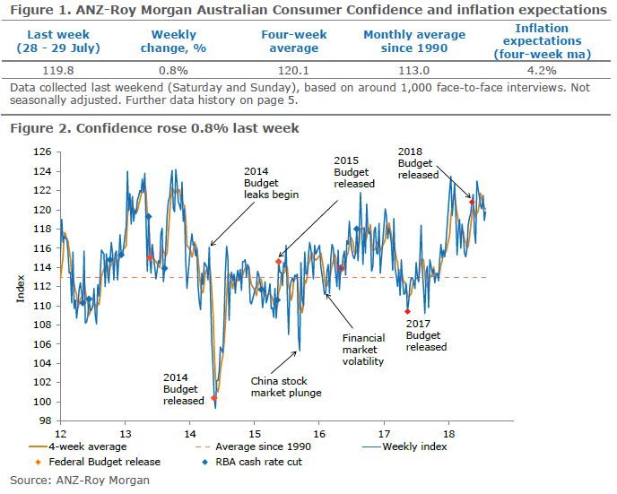 ANZ-Roy Morgan Australian Consumer Confidence firmed 0.8% to 119.8. The details were positive, with four out of five subindices posting gains.
