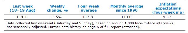 It is, however, important to note that households’ views towards economic conditions have been trending down since late June. In four week moving average terms, sentiment around future conditions has fallen below its long term average (112.5 vs 113.9). Still, views towards current conditions remain above their long term average for the moment and, as a result, so do aggregate economic conditions.”
