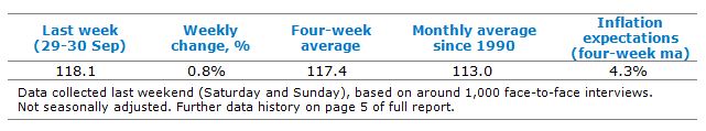 “Confidence rose slightly last week, more than reversing the previous week’s fall and broadly consolidating around the current level over September. Overall confidence remains above the long-run average. Importantly, consumers’ perception of the current financial situation registered a third consecutive weekly gain and is at its highest level since early 2018. Consumer resilience in the face of the weaker housing market and, more recently, the rise in petrol prices is encouraging.