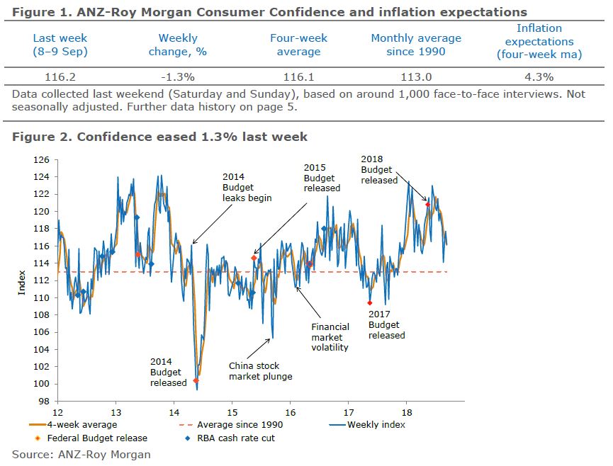 “Confidence was unable to hold on to all of the gains over the previous two weeks, despite a stronger-than-expected GDP report. After appearing to shrug off the news about higher interest rates from one major bank the previous week, the decision to raise mortgage rates by another two majors appears to have dampened sentiment. A sharp fall in households’ assessment of current finances last week certainly points toward this.