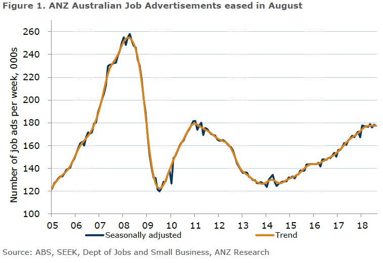 - On a seasonally adjusted basis, ANZ Australian Job Advertisements eased 0.6% in August, partially retracing the 1.4% bounce recorded in the prior month. On an annual basis, growth fell to 5.1% in August (vs 7.3% in July).