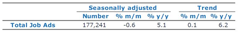 - In trend terms, job ads edged up 0.1% m/m last month, following a flat performance in July. There has been a clear plateauing in the level of job ads since April. In trend terms, job Ads grew 6.2% y/y to August (down from 6.9% y/y in July).