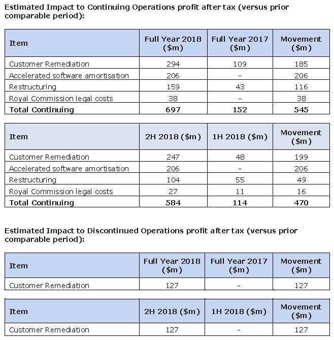 - External legal costs associated with responding to the Royal Commission which will total $55 million (pre-tax) for FY18.