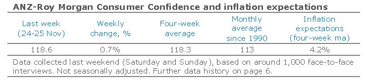 - ANZ-Roy Morgan Australian Consumer Confidence was up a notch last week, rising 0.7% and partially reversing last week’s drop.