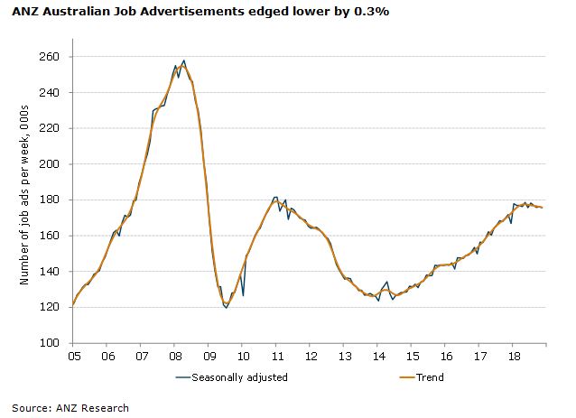 “ANZ Australian Job ads have effectively tracked sideways since the start of the year, with the annual growth rate losing momentum as a consequence. The level of job ads is still consistent with ongoing employment growth, however. More generally, a variety of labour market indicators point to further employment gains and a lower unemployment rate. We would, however, be concerned to see job ads sliding.”