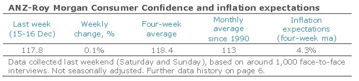 - ANZ-Roy Morgan Australian Consumer Confidence was essentially unchanged last week, rising just 0.1%.