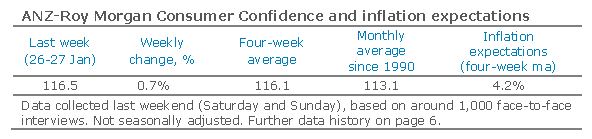 - ANZ-Roy Morgan Australian Consumer Confidence was up 0.7% last week, continuing its up-down-up pattern.
