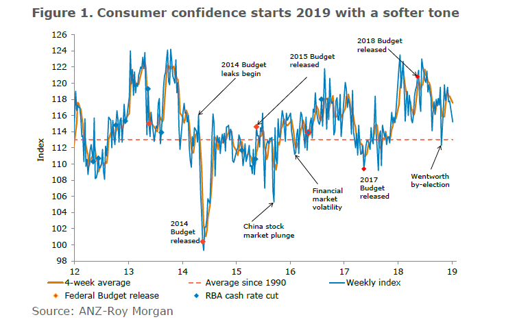 - ANZ-Roy Morgan Australian Consumer confidence has started 2019 with a fall of 2.2%.