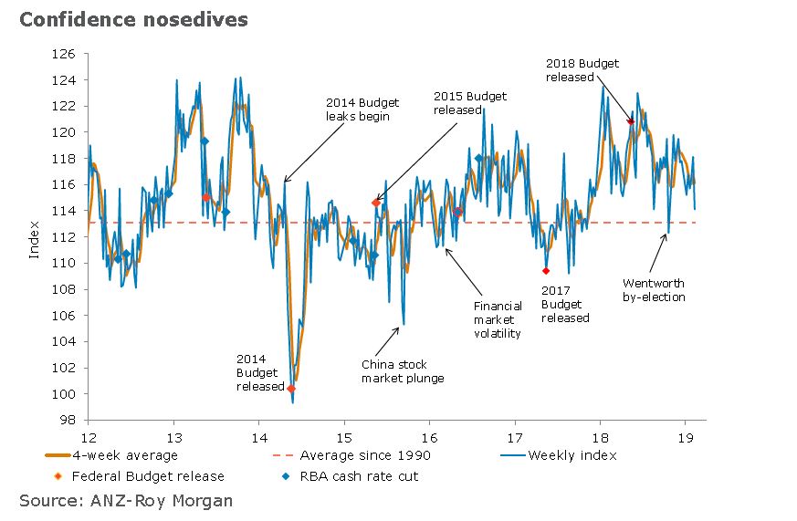 “Consumer confidence took a beating last week, most likely on the back of the RBA’s downgrade to its economic outlook. The fall reversed all the gains and then some since the weak reading seen at the start of this year. Weak retail sales and building approvals data may also have negatively impacted sentiment. Confidence still remains above the long-run average, however, as does the key current financial conditions sub-index. So we aren’t giving up on the consumer just yet.”