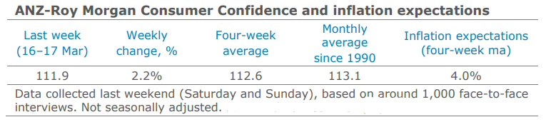 • ANZ-Roy Morgan Australian Consumer Confidence lifted by 2.2% after a fall of 4.6% last week. The index is still below the long term average of 113.1.