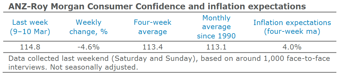 • ANZ-Roy Morgan Australian Consumer Confidence nosedived to 109.5, a fall of 4.6 per cent from the previous week’s reading. All the sub-indices were in the negative, with three components falling more than 5 per cent. The decline has also resulted in the headline index and each sub-index closing below their long-run averages.