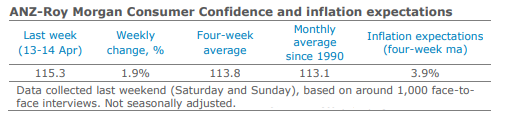 • ANZ-Roy Morgan Australian Consumer Confidence has bounced back, rising 1.9% last week. This reaffirms our prognosis that the post-Budget dip in consumer confidence was likely noise.