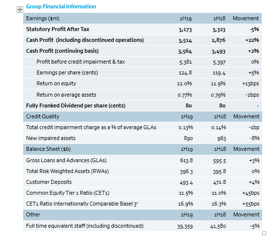 ANZ today announced a Statutory Profit after tax for the Half Year ended 31 March 2019 of $3.17 billion, down 5% on the prior comparable period. Cash Profit for its continuing operations was $3.56 billion, up 2%.