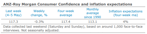 “Confidence was marginally down last week, though it is still well above average levels. There was not much in the way of local economic news to react to last week. It seems consumer sentiment is in a holding pattern for now. This pattern is likely to be disrupted on Tuesday afternoon, with the RBA expected to either cut the cash rate for the first time since August 2016 or clearly signal that a rate cut is on the cards.”