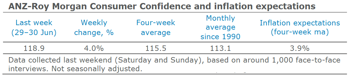 The ‘time to buy a major household item’ was up 3.2 per cent, taking it close to the levels seen last July. The four-week moving average for inflation expectations was stable at 3.9 per cent, although the weekly reading fell to 3.7 per cent.