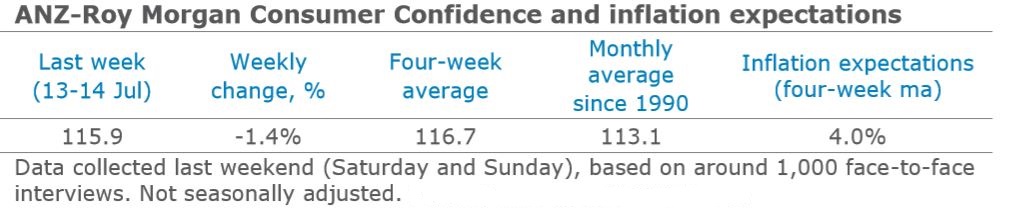“Confidence was down modestly for a second week," ANZ Head of Australian Economics David Plank said. "The developments in the week were mixed. The NAB monthly business survey remained soft, though some of the details on the labour market were better."