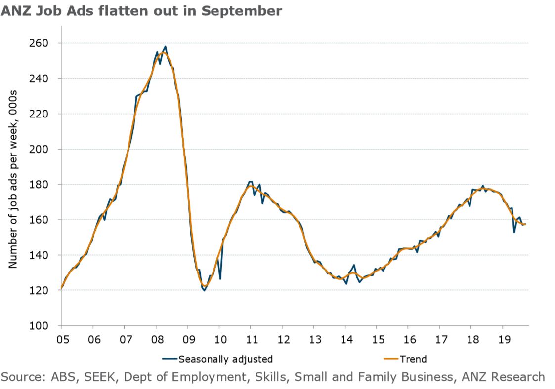 Job ads steadied in September but this does not necessarily indicate a turning point in the labour market. During August, the unemployment rate ticked up to 5.3% and job vacancies declined by 1.9% q/q. The job vacancies series is now converging with the ANZ Job Ads series after a period of divergence. The public sector appears to be responsible for the surprising strength in employment growth; ANZ Job Ads may be more reflective of the weakness in the private sector. We may see job ads deteriorate again in future months if the public sector strength is not sustained and if there is no significant change in momentum in private sector employment.