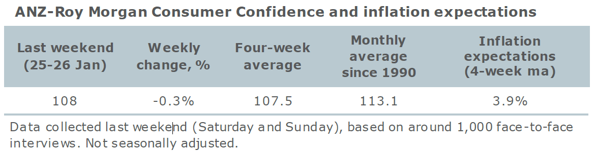 ‘Time to buy a major household item’ was down 2.4 per cent compared to a gain of 4.7 per cent previously. The four-week moving average of ‘inflation e xpectations’ was stable at 3.9 per cent.