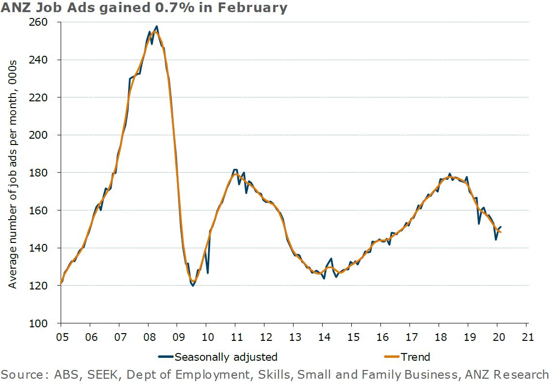 ANZ Australian Job Ads gained 0.7% m/m in February, but is still down 10.2% y/y. In trend terms, it declined 0.4% m/m and 12.1% y/y.