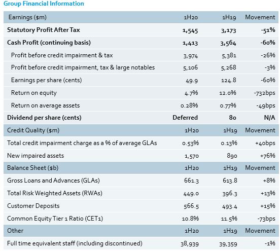 ANZ today announced a Statutory Profit after tax for the Half Year ended 31 March 2020 of $1.55 billion, down 51% on the prior comparable period. This decline was driven primarily by credit impairment charges of $1.674 billion that included increased credit reserves for COVID-19 impacts of $1.031 billion. The valuation of investments in Asian associates was impaired by $815 million, largely due to the impact COVID-19 is having in those markets.