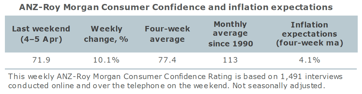 ‘Time to buy a major household item’ gained 17.5 per cent compared to a drop of 23.8 per cent previously. The four-week moving average for ‘inflation expectations’ was stable at 4.1 per cent. The weekly reading dipped to 4.1 per cent from 4.3 per cent.