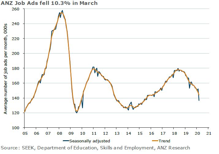 Job Ads dropped more than 10% in March, the largest monthly fall since January 2009, during the GFC. Most of the fall occurred over the second half of March as Australian COVID-19 cases escalated, restrictions on movement tightened, and