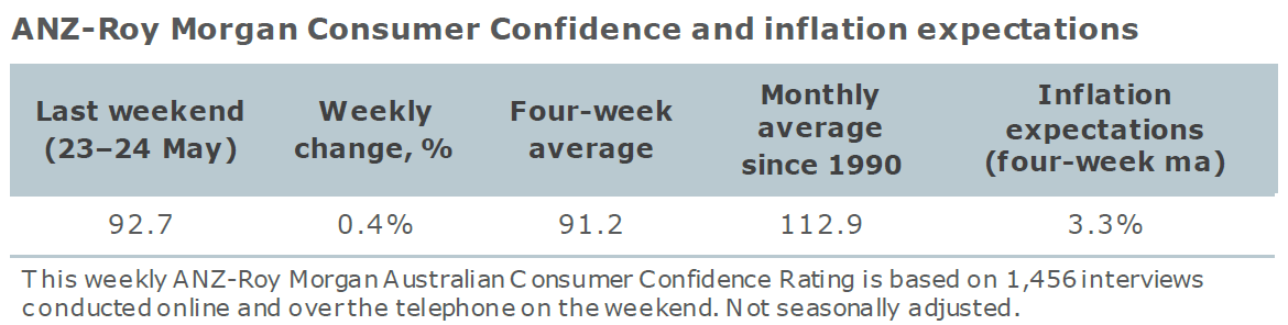 ‘Time to buy a major household item’ strengthened further, up 2.5 per cent. The four-week moving average for ‘inflation expectations’ declined 0.1 per centage point to 3.3 per cent, a new historic low.