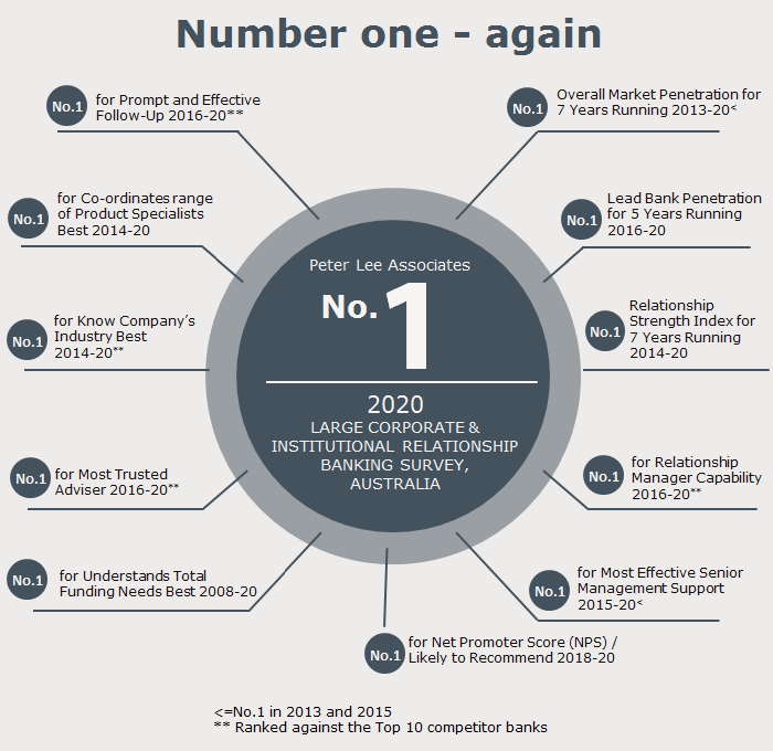 The Peter Lee Associates Large Corporate and Institutional Relationship Banking Survey is a leading indicator of performance across wholesale banking in Australia. Some 562 Australia-based large corporates and financial institutions with more than $500 million in annual turnover were surveyed.