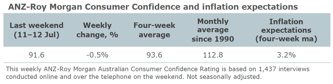 "Confidence declined further last week, building on the falls seen over the previous two weeks," ANZ Head of Australian Economics, David Plank said. "Consumer confidence is now down some 6 per cent from its level in mid-June as it recovered from the historic low seen at the end of March."