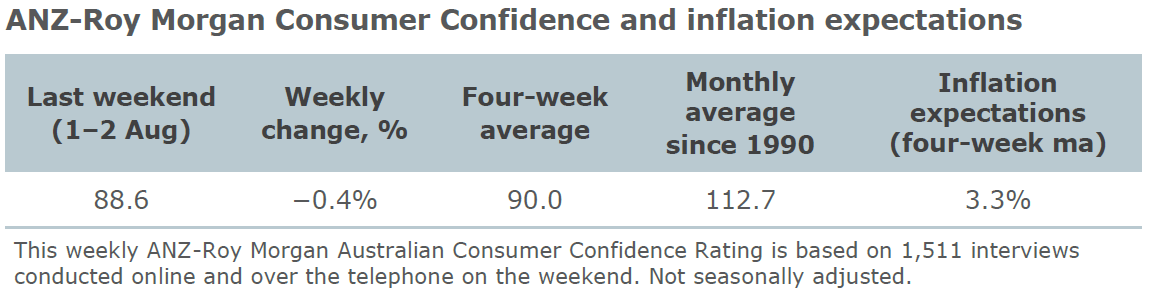 This week’s fall was driven by sharp weakness in economic conditions. Sentiment toward financial conditions was mixed. ‘Current finances’ declined by 0.6 per cent, while ‘future finances’ gained 1.6 per cent after three straight falls.