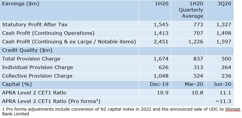 ANZ today announced an unaudited statutory profit for the third quarter to 30 June 2020 of $1,327 million with an unaudited cash profit from continuing operations of $1,498 million.